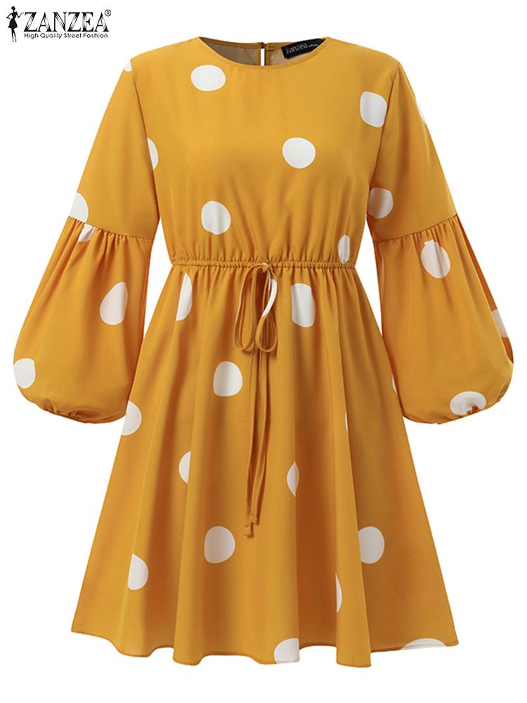 ZANZEA Lace-Up Puff Sleeve Islamic Clothing Women Polka Dots Printed Muslim Blouse Elagant Casual Dubai Marocain Turkish Tops