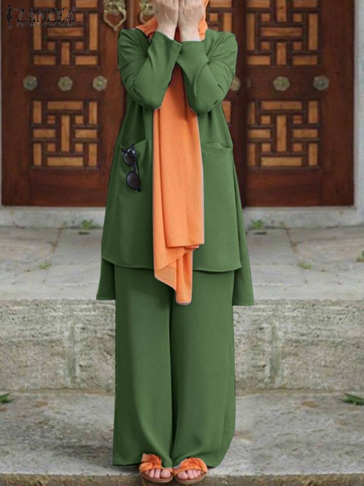 ZANZEA Women 2PCS Casual Abaya Hijab Tracksuit Vintage Muslim Pant Sets Summer Long Sleeve Blouse Suits Loose Matching Sets