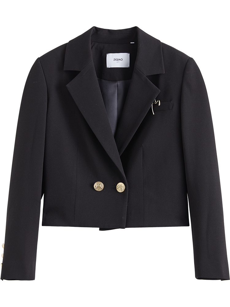 ZIQIAO Japanese Suit Collar Full Regular Sleeve Short Blazers Loose Office Lady Detachable Brooch Solid Double Breasted Jacket