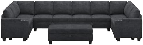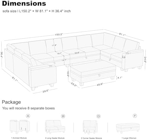 We purchased the 10 seater in dark grey. It came with 4 of the 2 seater sections, 2 corners, 2 armrests, and the large ottoman. It came in 8 packages. They were packaged really well. All cushions were vacuum sealed. Super easy to put on the plastic washers and legs for each piece and then slide the back pieces on. Each section connects together super easily. The ottoman came with metal bars and since every couch piece has holes in the base, you can place the ottoman wherever you want it and keep it from moving around using those bars placed in the holes. Every piece opens up and has quite a bit of storage. There is a tab you can use to open them, or you can tuck the tab in the base so you don’t see it. Each seat cushion has Velcro on the bottom so you can attach it to the base if desired. The back cushions just sit on the couch. It is firm, but also very cozy. The actual height of the back of the couch is only 28 inches. When the back cushions are stood up straight, that’s the 36 inches height, so it is a shorter couch than expected. We love how modular it is and how easy it is to move and connect the couch differently. The only issues we’ve had so far with the couch is that the back pieces tend to bend/creak if you sit back hard enough. We don’t have it against a wall, so it’s not as sturdy as we would like it to be. And then also, the color was not what we expected. It definitely has a lot of blue in it. Like a dark navy blue and grey in it. But it’s still really pretty. Overall a good purchase, and good couch for a family.