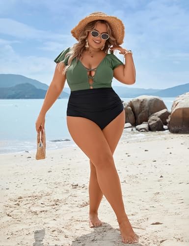 • Plus size swimsuit for women feature deep v neck, front crisscross, ruched details at the waist, ruffle sleeve and backless design.