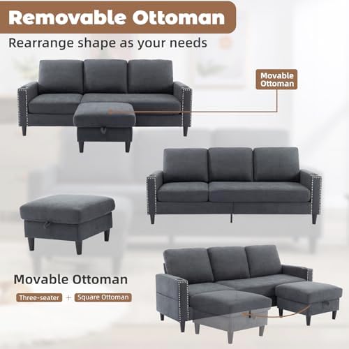 Convertible Sectional Couches for Living Room, L-Shaped Couch 3 Seats Sofas with Storage Chaise & 2 Cup Holders, Small Sofa for Apartment, Compact Spaces, Dark Grey