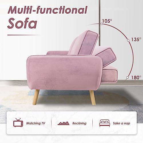 Crownland Futon Sofa Bed, Loveseat Sofa with Velvet Pillows, Mid-Century Modern Style Folding Sofa for Living Room, Bedroom, Apartment (Pink)