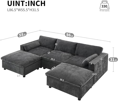 Two removable ottomans can be used as additional seating or as a place to prop up your feet while lounging on the sofa. This can be especially useful when you have guests over and need extra seating.