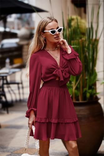 PRETTYGARDEN Women Long Sleeve Swing Mini Dress Tie Front Flare Short Dress