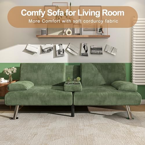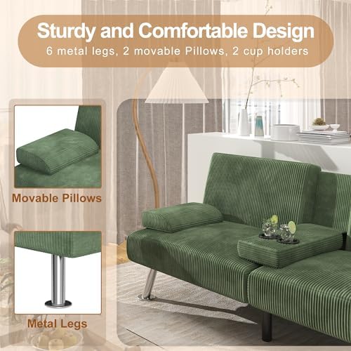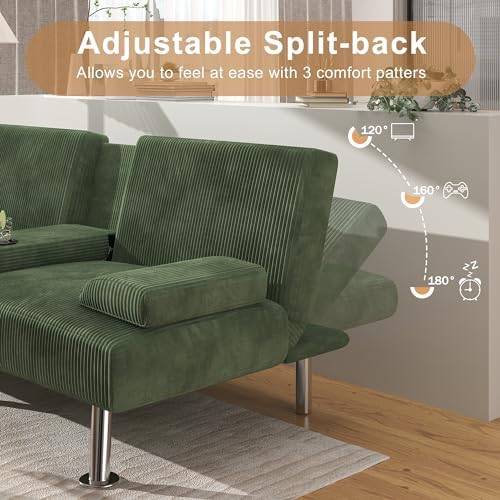 Shahoo Convertible Folding Futon Sofa Bed Sleeper Couch Q1: What's it made of? A1:Unlike other sofas, this sofa is upholstered in premium corduroy, which is delicate and soft to the touch and easy to clean and have a better warmth retention. Q2: What are its dimensions? A2:The longest side of this sofa is 65", if you are taller than this, you will need to curl up when sleeping on it, which is a slight inconvenience, so we recommend that you use it with an ottoman. Q3: How much weight can it support? A3:It has been tested to have a load bearing capacity of around 500lbs and is perfectly capable of taking two people sitting on it. Q4: How can I use it? A4:Once installed, just use a little force to slowly straighten its backrest and lower the small table with cup holder in the centre, and he becomes a sofa for two people, on which you can sit and chat with your friends and enjoy your leisure time! Q5: Why can't I find the couch leg part or the cup holder part?? A5:You can look for them on the back of the sofa, some of the parts are in the back of the sofa.
