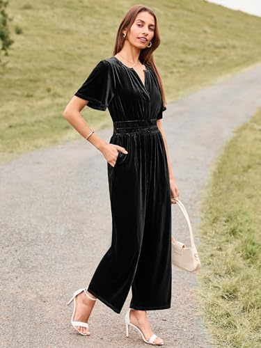 Simplee Womens Short Sleeve Wide Leg Velvet Jumpsuit Dressy V Neck Elastic Waist Formal Jumpsuits 2024 Winter Holiday Outfits