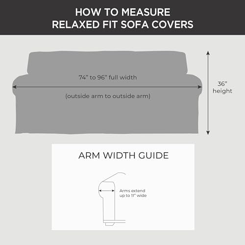 Sure Fit Home Décor Sailcloth Cotton Duck Box Cushion Sofa One Piece Slipcover, Relaxed Fit, 100% Cotton, Machine Washable. By popular demand, a slipcover in a durable Heavyweight 8-ounce Cotton Duck with a rugged, distinctive natural texture; opaque enough to cover dark colors or patterned furniture, Heavyweight Cotton Duck features a straight waterfall skirt and finishing details including straddle topstitching at arms and ties. Fits most Sofas 74"-96" when measured across furniture outside arm to arm. Made with 100% cotton. Patented one-piece design with relaxed straight skirt, cinched seat elastic and adjustable ties. Machine wash separately in cold water on gentle cycle and tumble dry low. Do not use bleach. Do not iron.