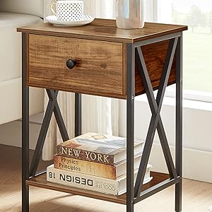 This bedside table is designed to be robust. Constructed from high-quality materials and X shape metal frame, it has a weight-bearing capacity of up to 50 pounds.