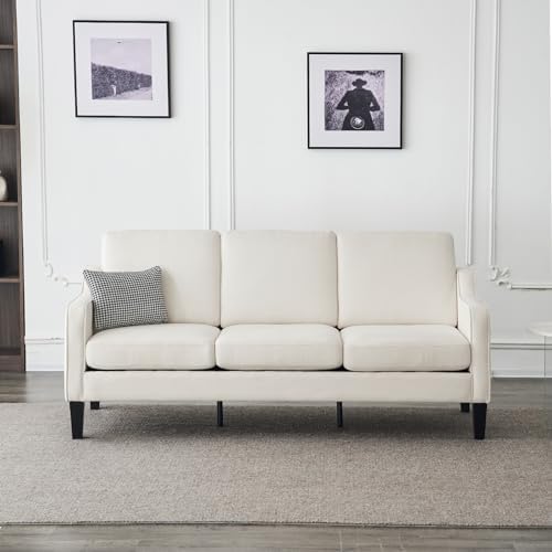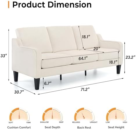 I rent the upstairs from a friend's mom so my review is for a smallish type of living space and this sofa is replacing an aged futon. The sofa is the same width as the futon and looks really cute, although the color does have a slight bluish tint to it. Putting together is SUPER easy. Everything screws in by a hex key or a knob. Took me almost exactly one hour by myself from pushing the box up the stairs to moving it where I wanted it. Assembly is a breeze, but if you can't lift heavy weight get some help as the box is hefty before opened. It's not expensive and doesn't pretend to be, but the cushions are a nice medium firmness so good support and it's comfortable and seems sturdy enough. If you're looking for a cheap option for a garage or something like a guest area, this thing is great! One thing I will say is to be sure to take your time to make sure everything is lined up and secured properly and follow the directions. Otherwise you may end up with some crooked pieces. Other people in the reviews complained about that, but I really think they were either frustrated, in a hurry, or both. I did this while watching TV in the living room so not much space is needed for assembly. I will give this a month or two then maybe consider ordering the matching chair to replace my red one that now does not match. Great value for under 250 dollars!