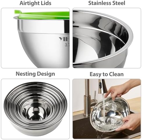 Our stainless steel mixing bowls have all the sizes you need for cooking, baking and more, set includes 4.5 , 3.6 , 2.7, 2.1 , 1.7 ,1.1 , 0.7quart, great to use for serving bowls to serve fruits, salad bowls, ingredient, cereal bowls, cookie bowls,and much more.