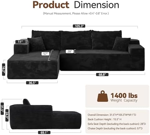 Cozy and Modern: The Perfect Sectional for Any SpaceI couldn’t be happier with my 104" Cloud Sectional Couch! It’s exactly what I was looking for—super comfortable, modern, and a perfect fit for my space. The deep seat and comfy chaise make it an ideal spot for lounging, and the sleek black design adds a touch of elegance to my living room.I was pleasantly surprised by the delivery process. The couch came in two boxes, vacuum shrink-wrapped, making it easy to handle. Once unpacked, it expanded into a spacious, plush sectional that feels just as good as it looks. The modular setup is also a huge plus, offering flexibility to fit different rooms, whether in the living room, bedroom, or a cozy apartment lounge.Overall, this couch is a must-have if you’re looking for a blend of comfort, style, and versatility!