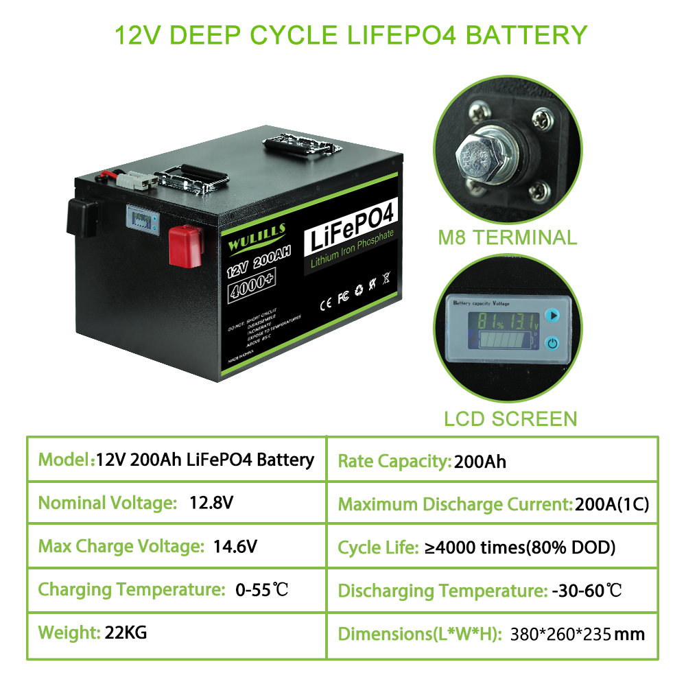 Features 1: 12V 200Ah LiFePO4 Battery : Warranty: 5 Years