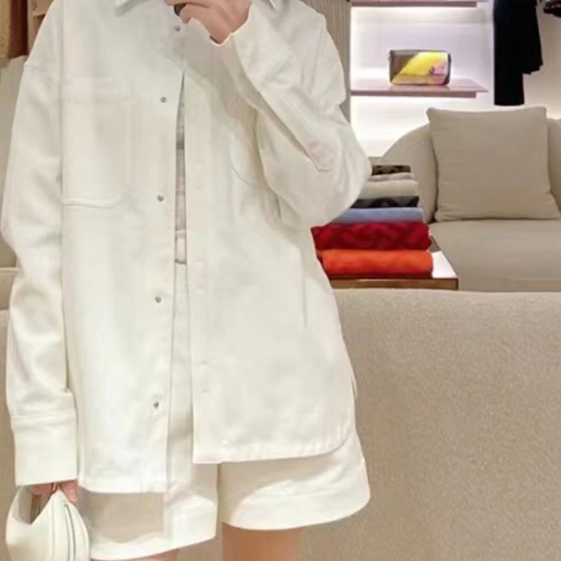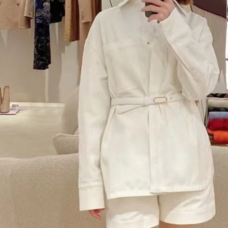 22 Leisure White Denim High Waist Shorts Suits Women Lapel Pocket Long Sleeve Belted Denim Jacket Pleated Lettering Buckle ShortA0474
