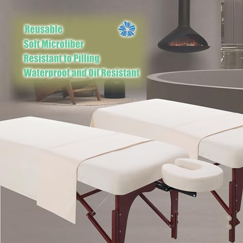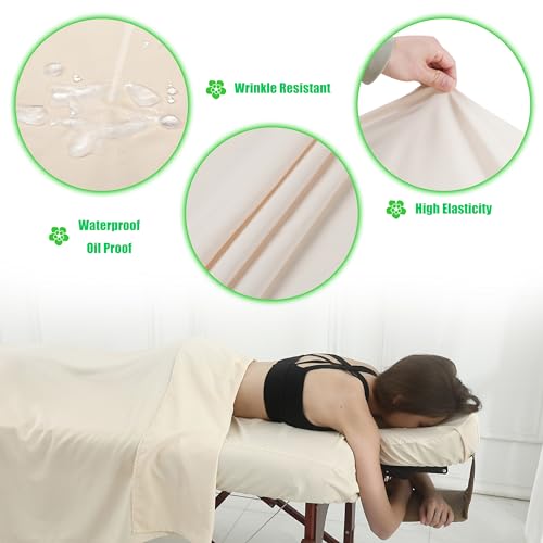 These are nicer than I thought they would be. I was nervous they would be more stiff and coarse but they are pretty soft. They fit my table which has a layer of egg carton foam, thick table warmer and water-proof cover. The elastic is not super tight but it stays on well for me. The color beige is more yellow than the photos- like a butter beige color. The head rest covers also fit over a large head rest with plenty of room- kind of loose. No complaints- wish they were a little softer but still good for the money.