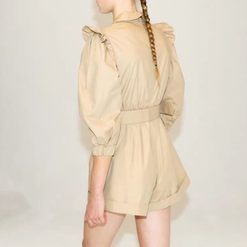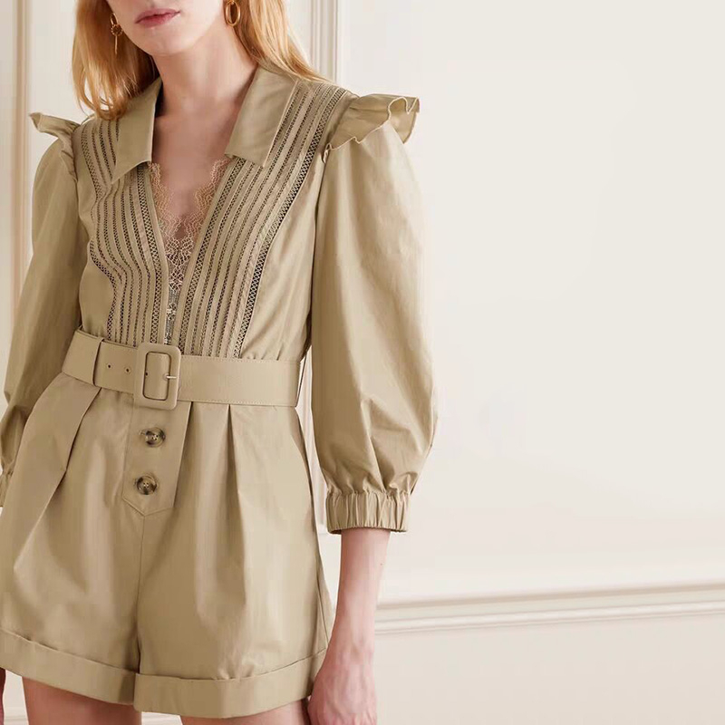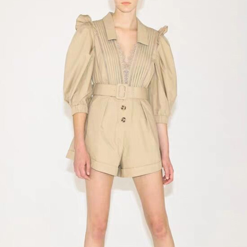 BUSHRA Casual Patchwork Lace Women Short Jumpsuit V Neck Lantern Short Sleeve High Waist With Sashes Hollow Out Playsuit Female