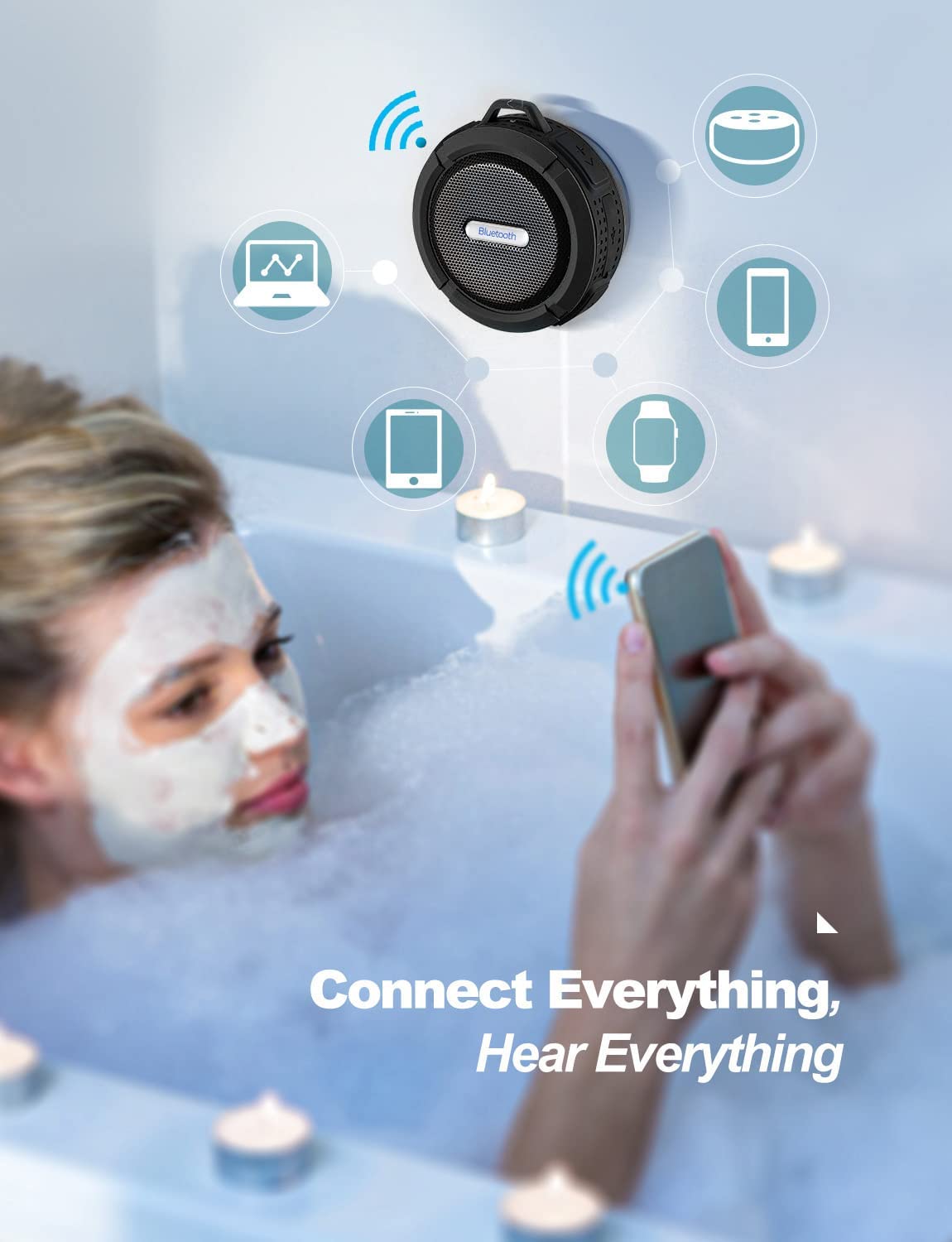 Easy to Connect- Waterproof shower speaker is compatible with all Bluetooth devices, phone, computers and even Echo series. Bluetooth ensures instant pairing for waterproof speaker and maintains a strong connection up to 33 ft.