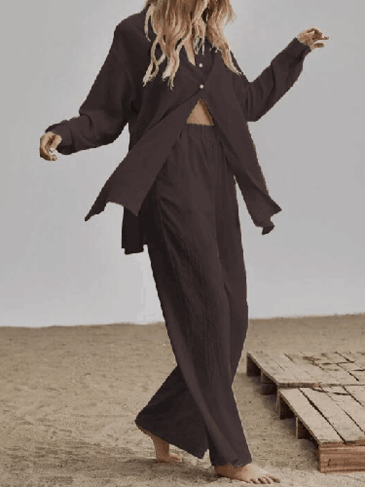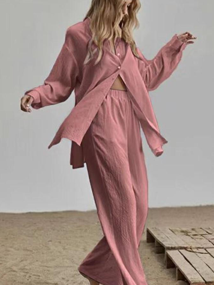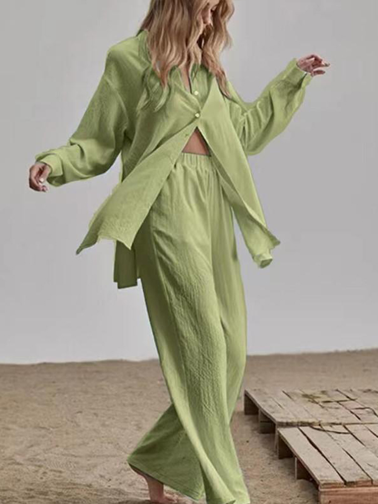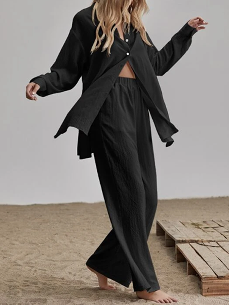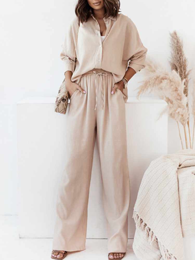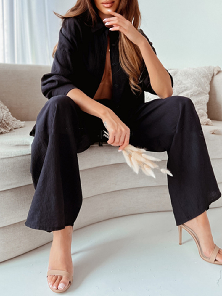 Casual Loose Solid Two Piece Sets Women Elegant Turndown Collar Cardigan Tops And Wide Leg Pants Suits Female Outfit