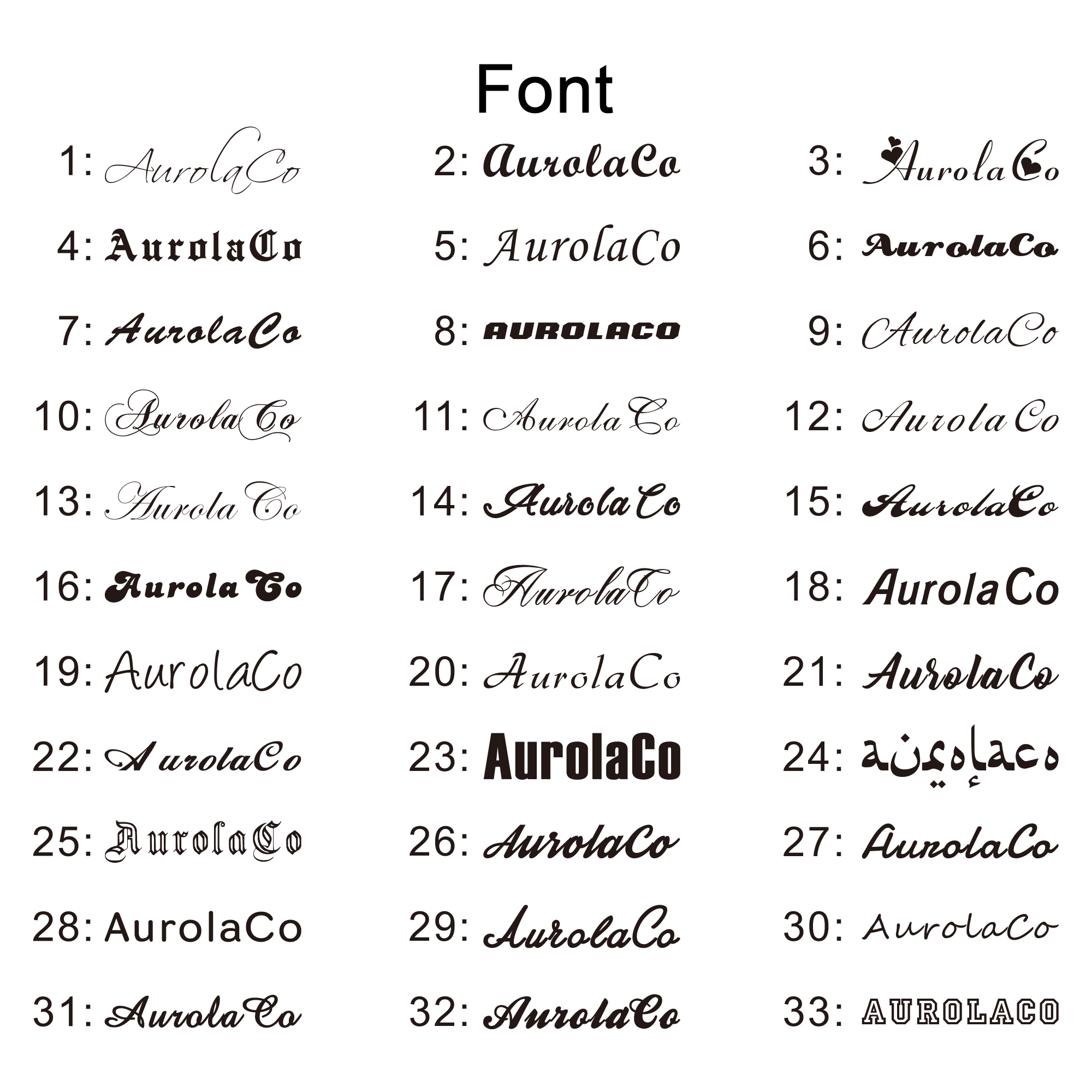 A: Leave your name or said words(at most 15 Byte) and font when you pay.(such as: Freya , font 3)