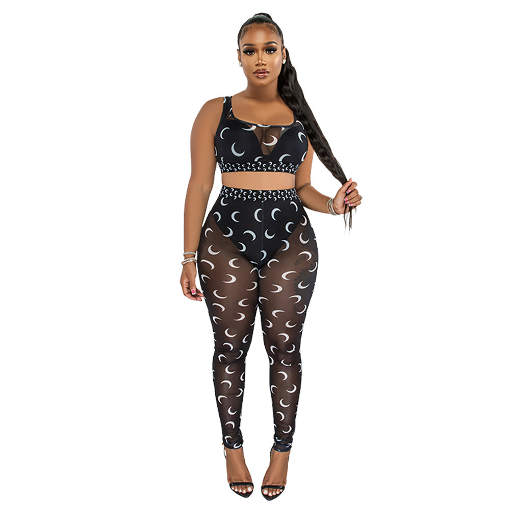 Echoine Women Sexy Moon Print Sheer Mesh Two Piece Set Club Suit Tank Crop Top Leggings Pants Party Nightclub Tracksuit Outfits
