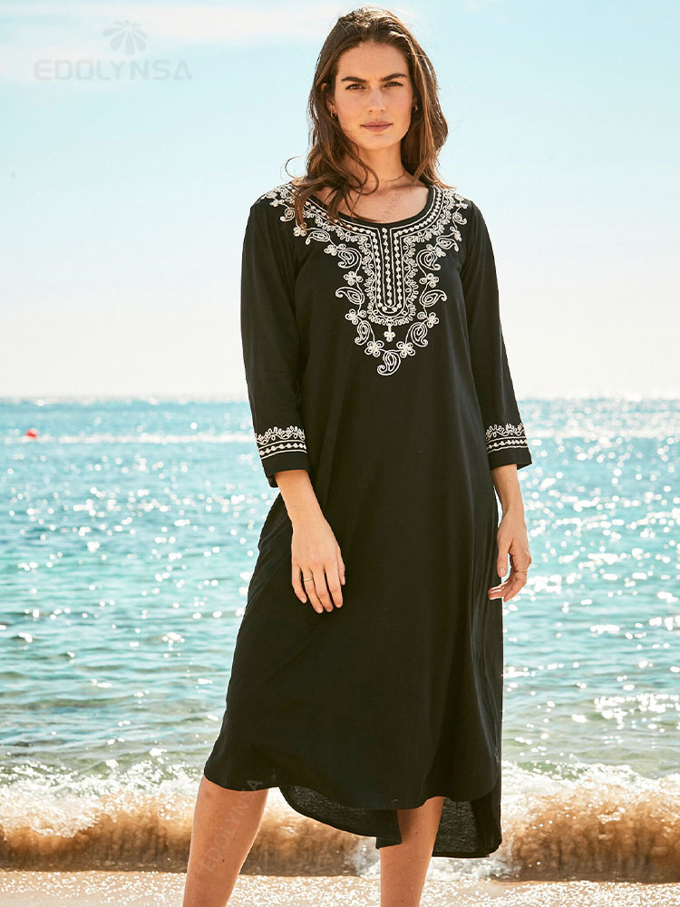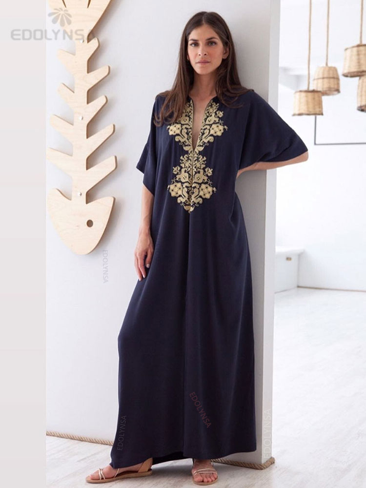 Elegant Gold Embroidered Kaftan Retro V-neck White Dress Women Clothes Summer Beach Wear Swim Maxi Dresses N1373