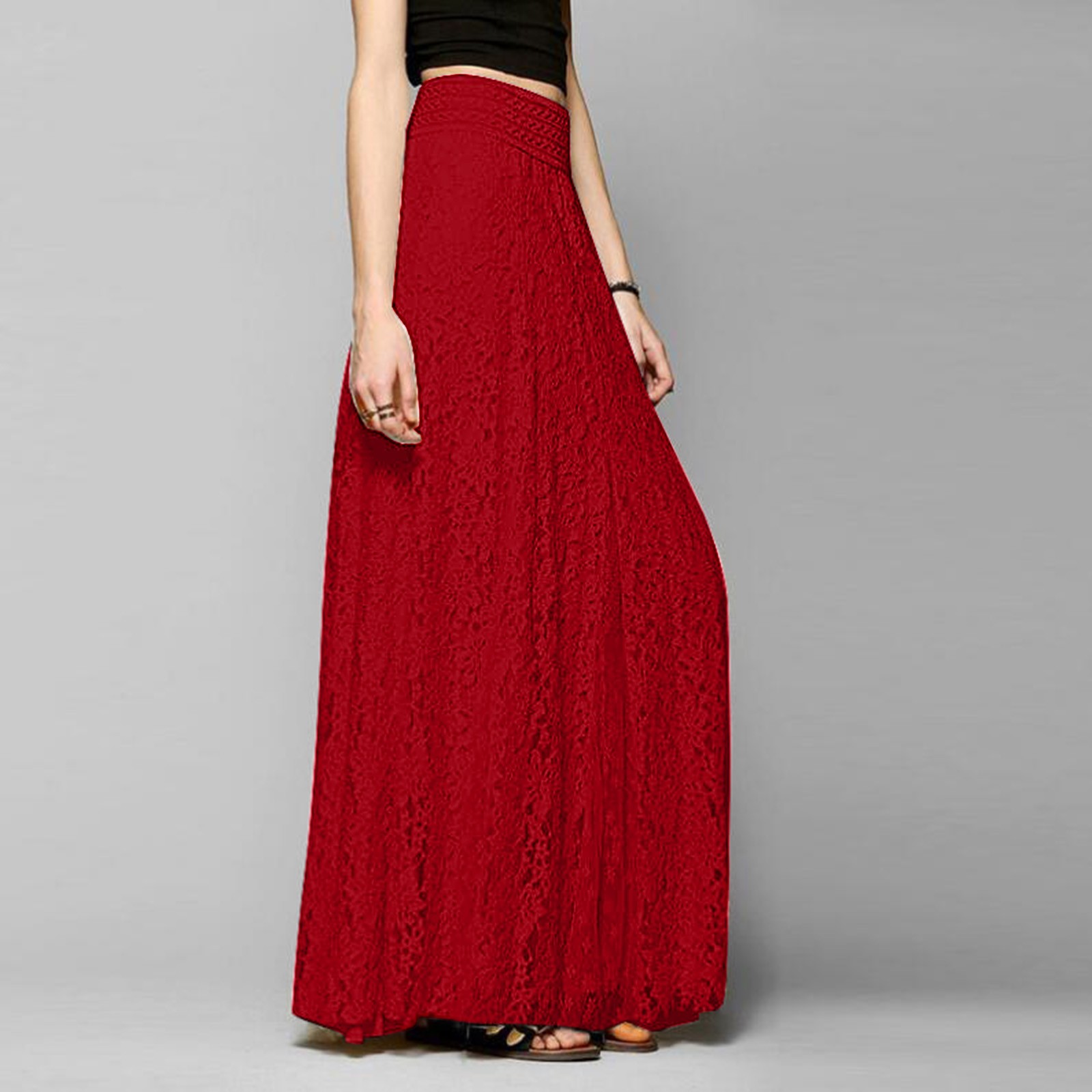 Women Lace Double Layer Pleated Long Maxi Skirt Elastic Waist Skirt