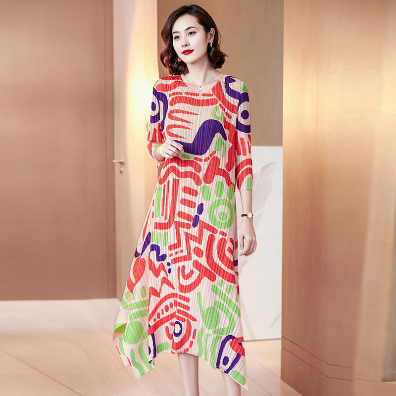 French printed dress autumn Miyake folds temperament loose large size women's dress was thin mid-length dress clothing