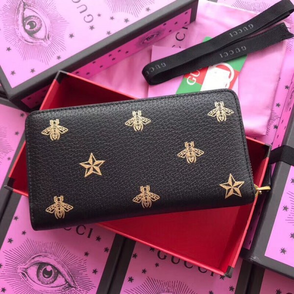 The Gucci bee—a historical symbol from the ’70s archives—is combined with the star motif. The print appears in metallic gold printed against black leather in the long zip around wallet.