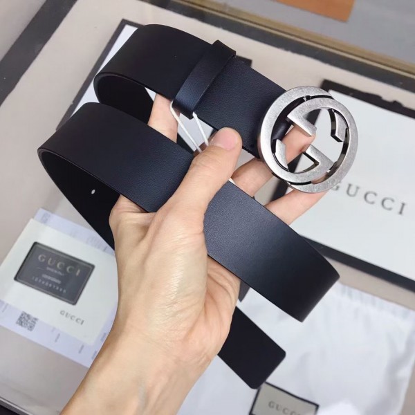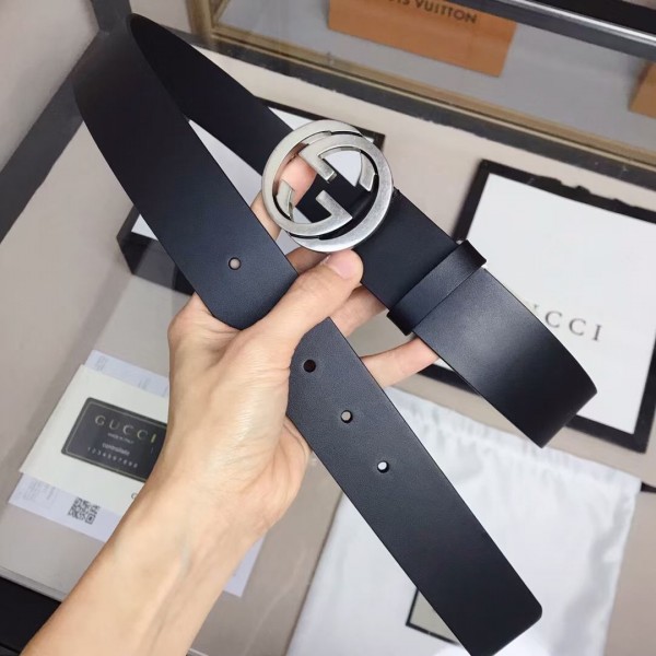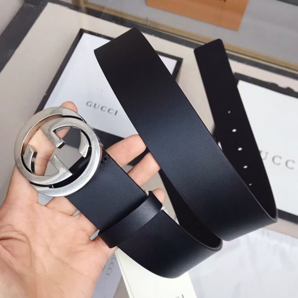 Brand new, Gucci belt comes in sleek black leather with an interlocking GG silver palladium-toned buckle, making this the perfect belt to match with just about any outfit. This classic Gucci belt is a true staple piece.