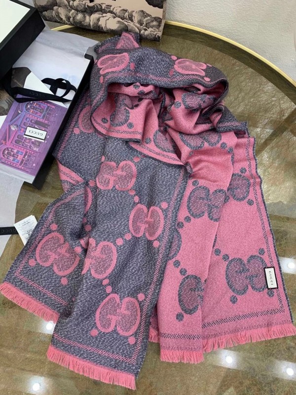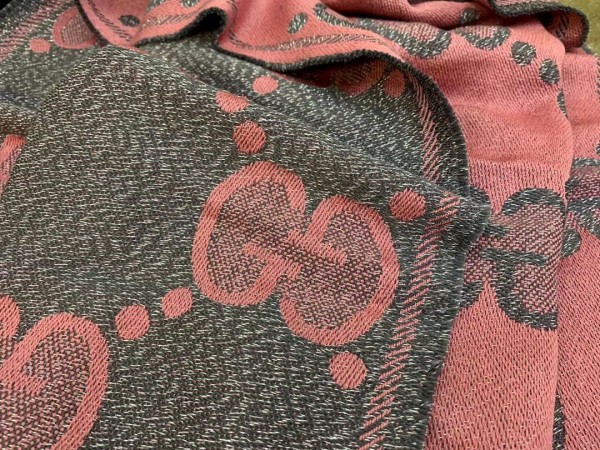 The initials of the founder of the House, Guccio Gucci, alternate across this jacquard scarf. Presented in a contrasting color combination that alternates on the front and the back, the accessory is further accentuated by sparkling lamé. Perfect for winter and mid-season weather. The fringed finish adds a final, luxurious touch.