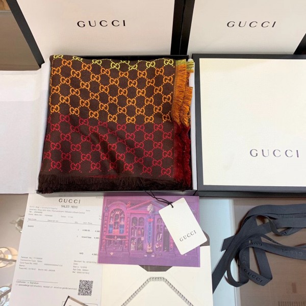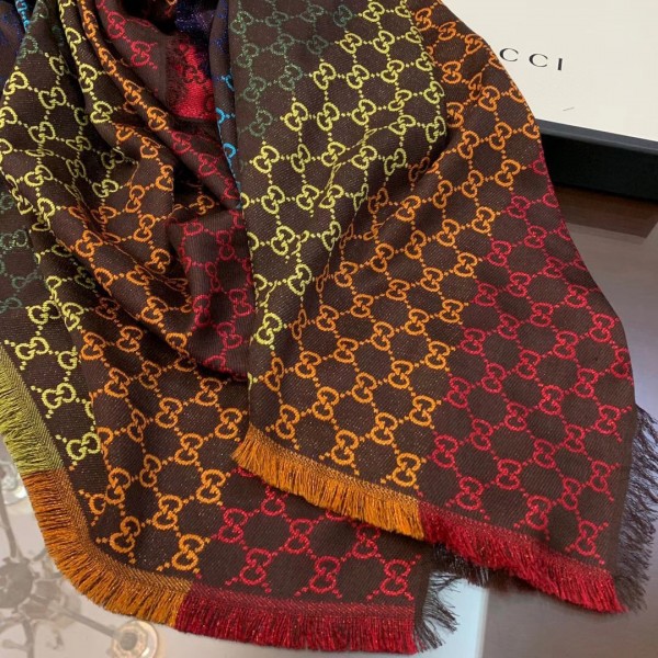 An evolution of the original Gucci rhombi design, the GG logo has become an established symbol of Gucci’s heritage. Integrated within the Cruise 2019 collection, the distinctive pattern is reimagined in combination with a metallic rainbow pattern. It is crafted from a blend of viscose, cotton, silk and wool for an accessory that feels supremely soft to the touch and is lightweight to wear.