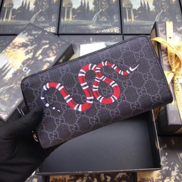 The Kingsnake, in vibrant colors, continues to emerge as one of the signature details of the House’s eclectic narrative. Here, it is printed across a zip around wallet made in GG Supreme canvas, a material with low environmental impact.