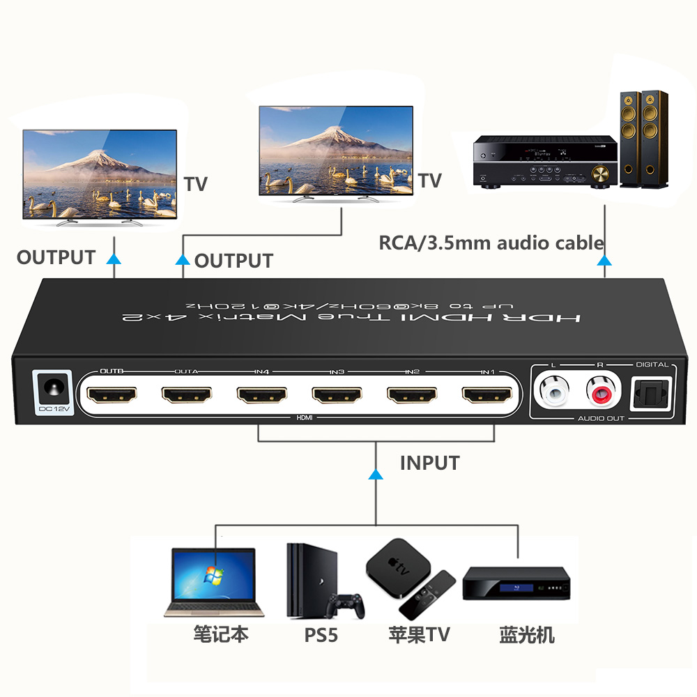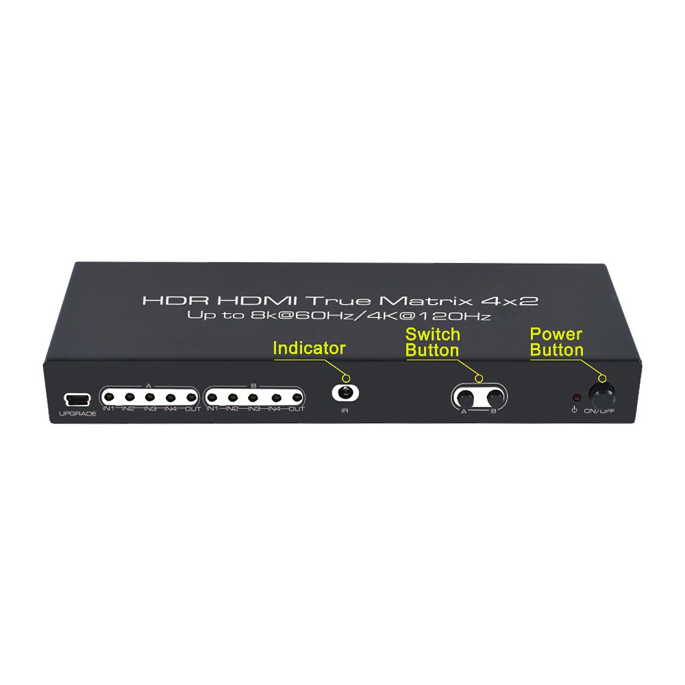 ②In matrix mode(In this mode, the outputs of A and B are different), output ports A and B cannot output 8K signals at the same time. Only one group is allowed to output 8K and the other group output 4K or less.