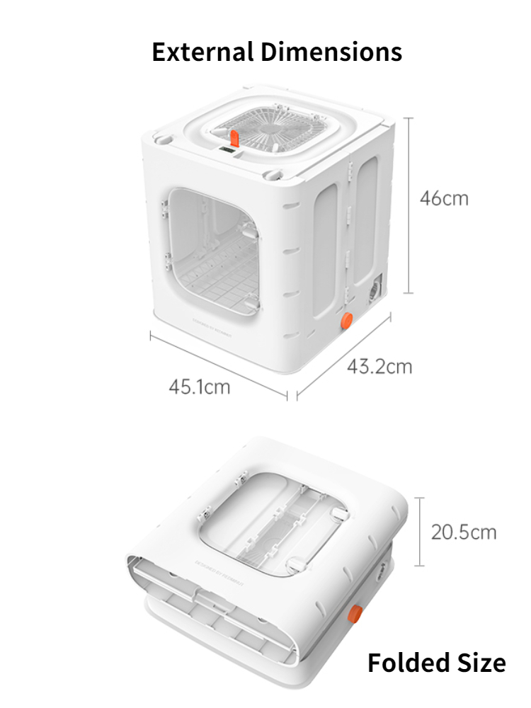 The size of the pet drying box is 42*40*37(cm) All cats with long and short hair within 25 catties can use it with confidence, and it is suitable for drying multiple cats at the same time. Cats under 8 catties can accommodate 3 cats and cats under 13 catties. Can hold 2. Dogs under 25 pounds can also be used for dogs over 25 pounds and less than 30 pounds. It needs to be judged according to height, body length and body shape.4. How long does it take to dry a cat?