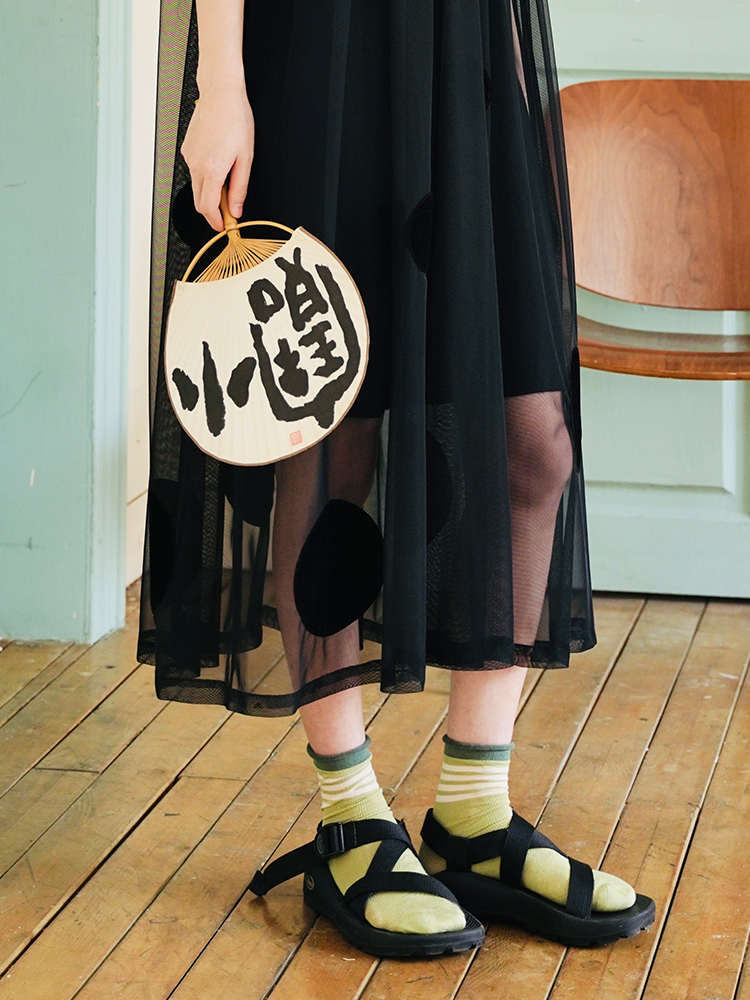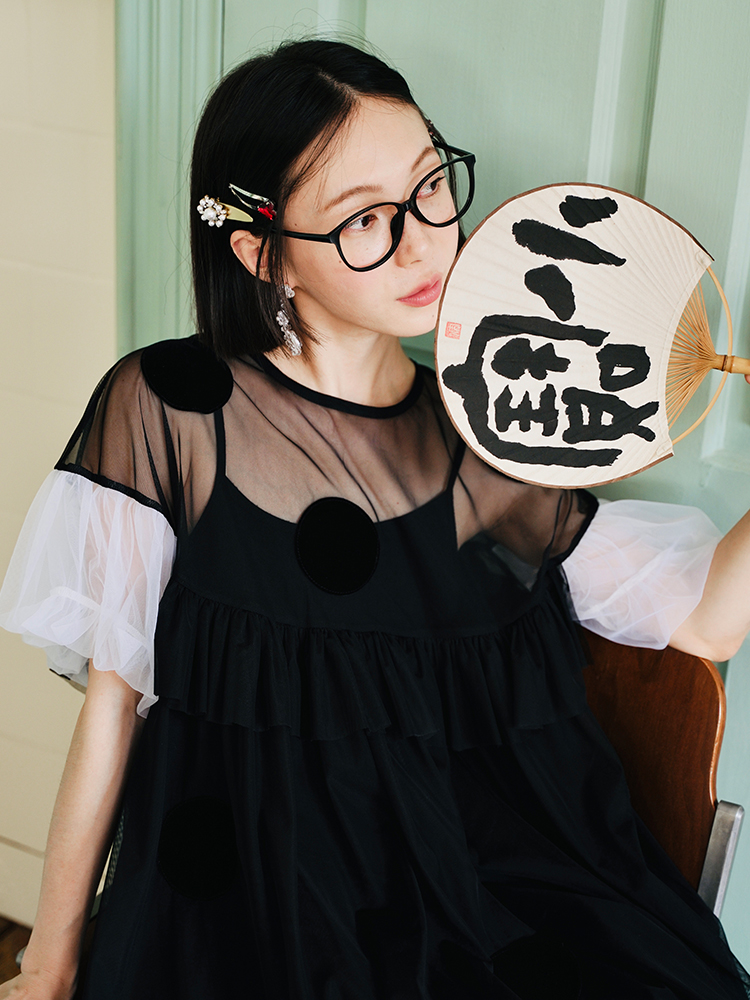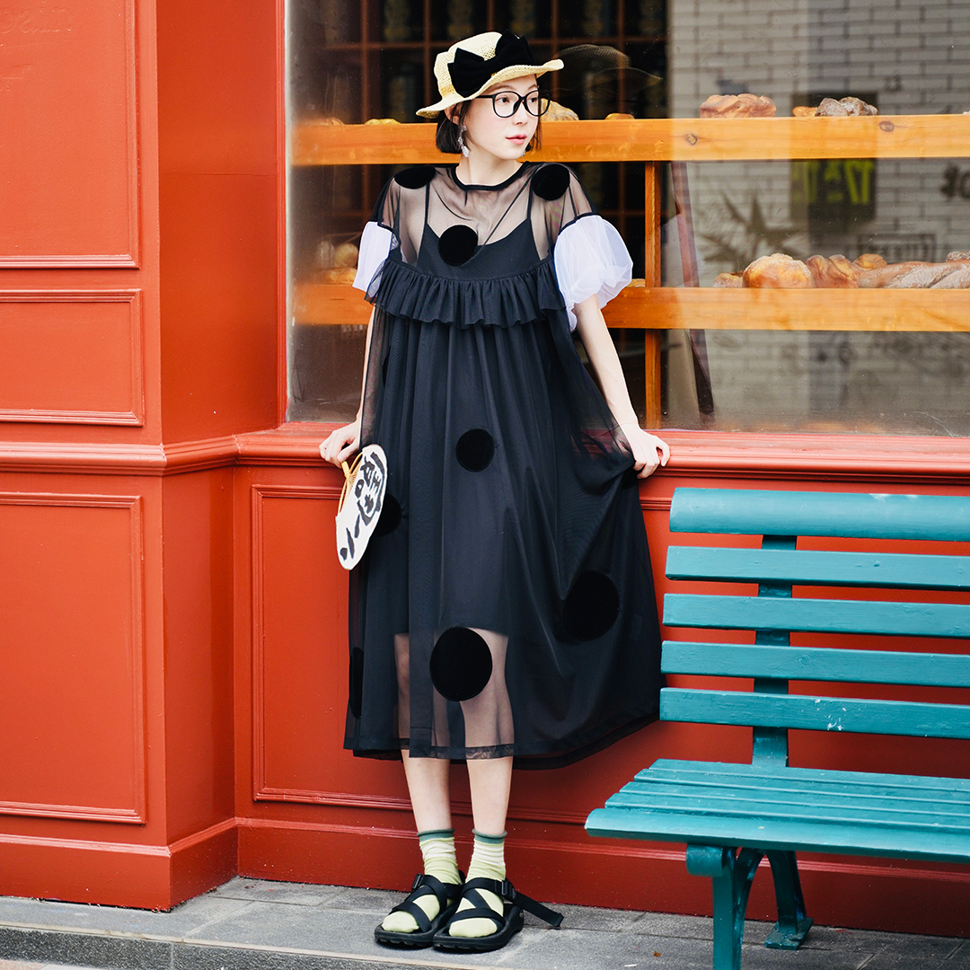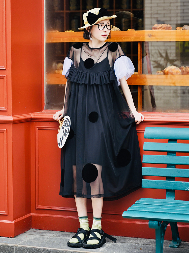 Imakokoni Original Summer polka dot patchwork gauze skirt Dress with loose bubble sleeves for Women 223771