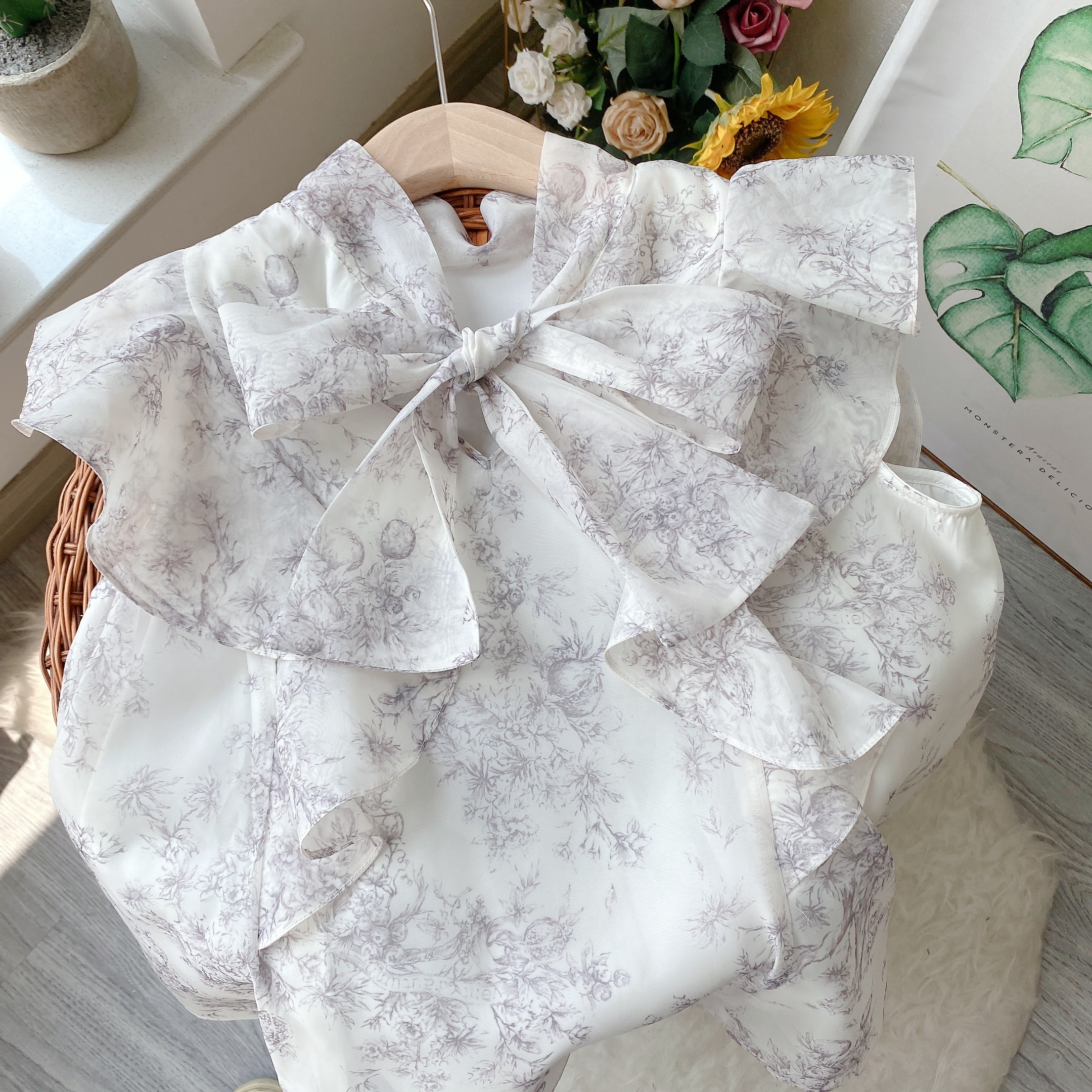 Kuzuwata Japanese Temperament Sweet Blouse Summer Shirt Stand Collar Lace Up Bowknot Print Flying Sleeve Mujer Blusa