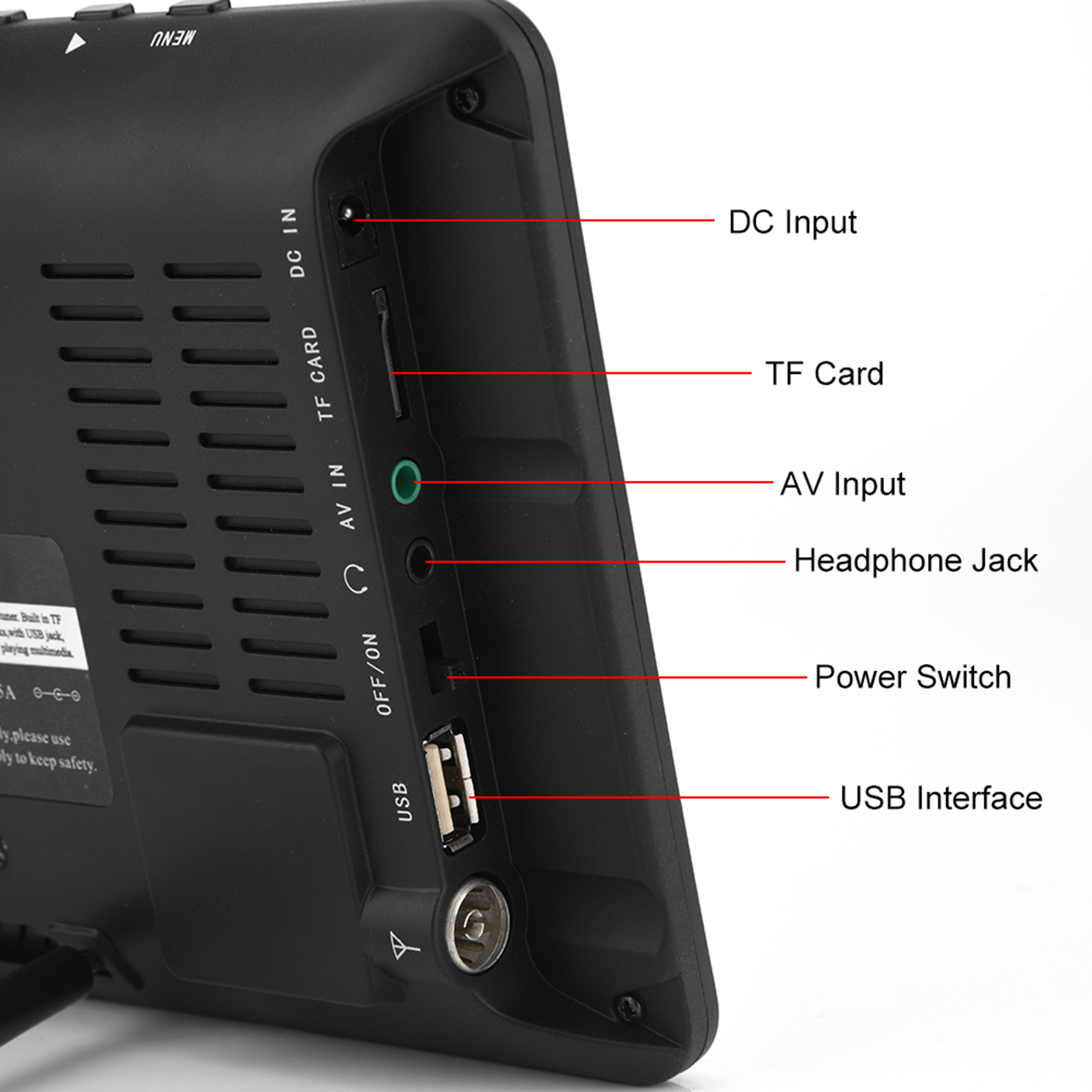 Antenna Interface, AV Input Interface, Headphone Interface, USB Interface, Power Interface, Power Switch, TF Card