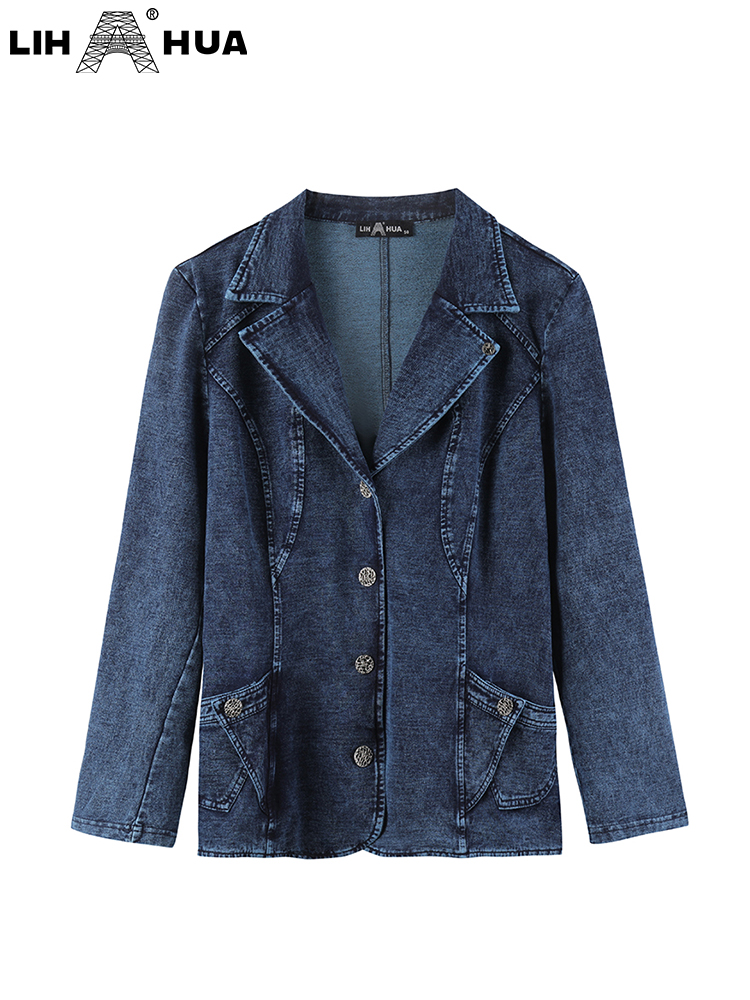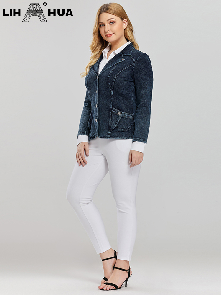LIH HUA Women's Plus Size Denim Suit Fall Jacket Knit Stretch Long Sleeve Button Jacket
