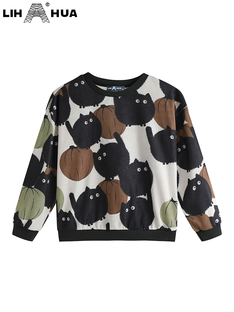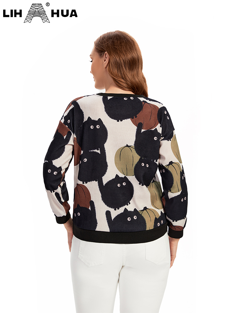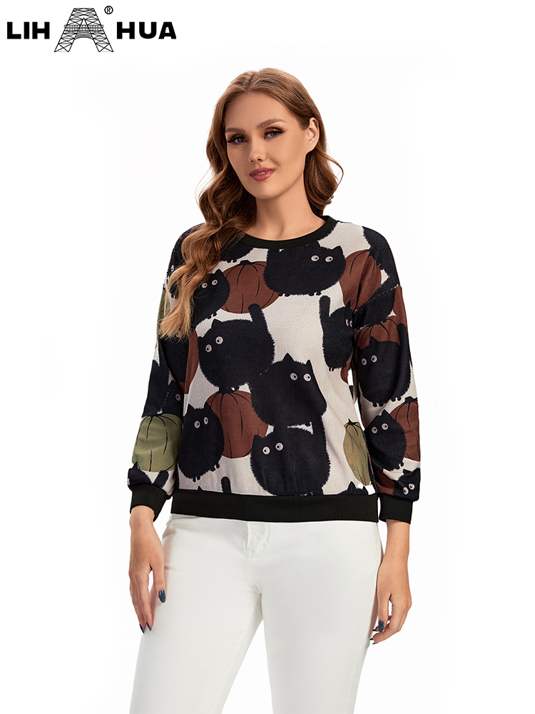 LIH HUA Women's Plus Size T-Shirt Spring Cotton T-Shirt Long Sleeve Printed Cartoon Graphic Top Round Neck Elastic Loose Top