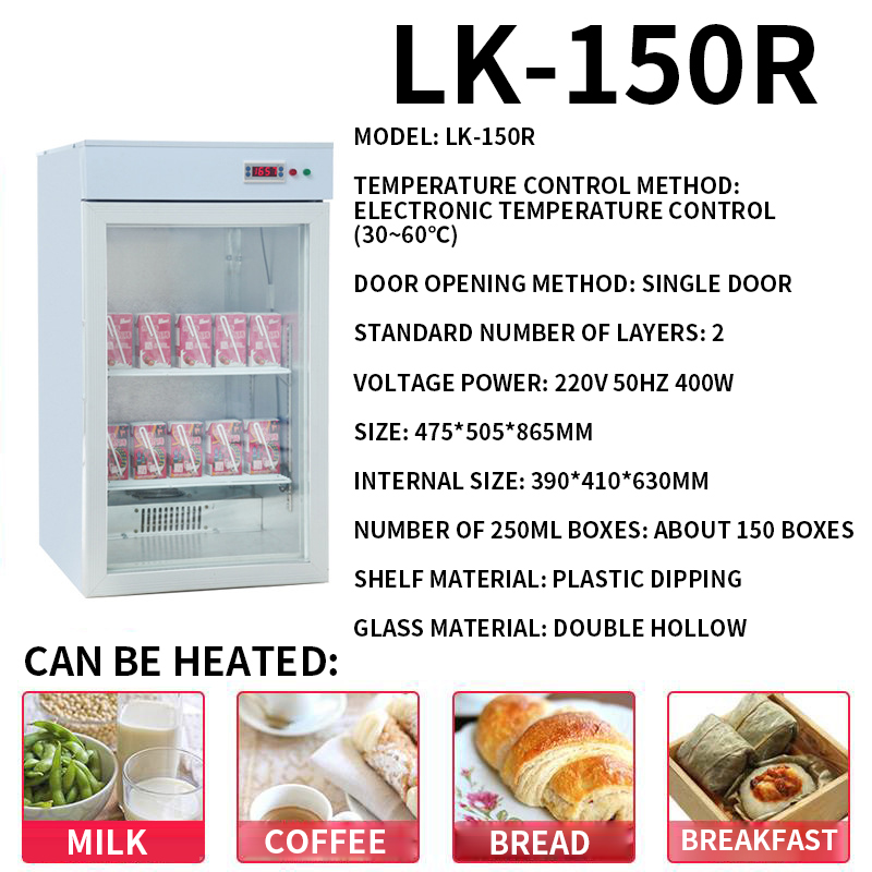 Model: LK-300R Temperature control method: electronic temperature control (30~60℃) Door opening method: single door Standard number of layers: 3 Voltage power: 220V 50Hz 800w Size: 635*745*1270mm Internal size: 550*650*980mm Number of 250ml boxes: about 300 boxes Shelf material: plastic dipping Glass material: double hollow