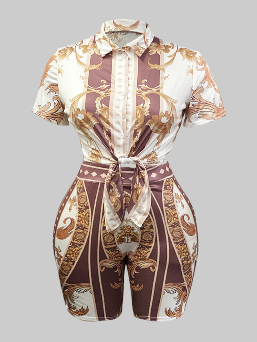 LW Plus Size Turndown Collar Baroque Print Shorts Set Sexy Two Pieces Hubble-bubble Sleeve Women Clothings Lady Outfits