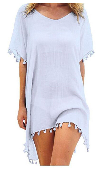 Meihuida Vintage Women Beach Dress Solid Mesh Cover-Ups Beachwear Ladies Tassel Swimwear Short Sleeve Bathing Chiffon Cover Up