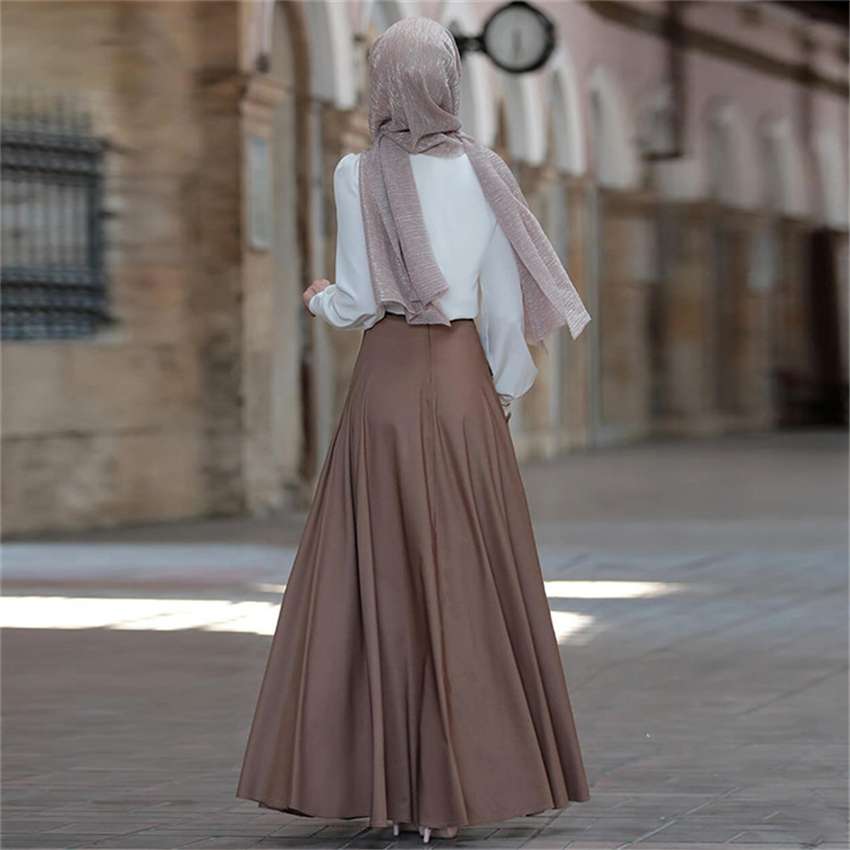 2022Muslim Elegant Skirt Islamic Dubai A-Line Pleated Turkish Solid Half Dress Hight Waist Big Swing Buttons Party Wear