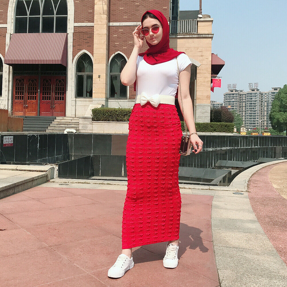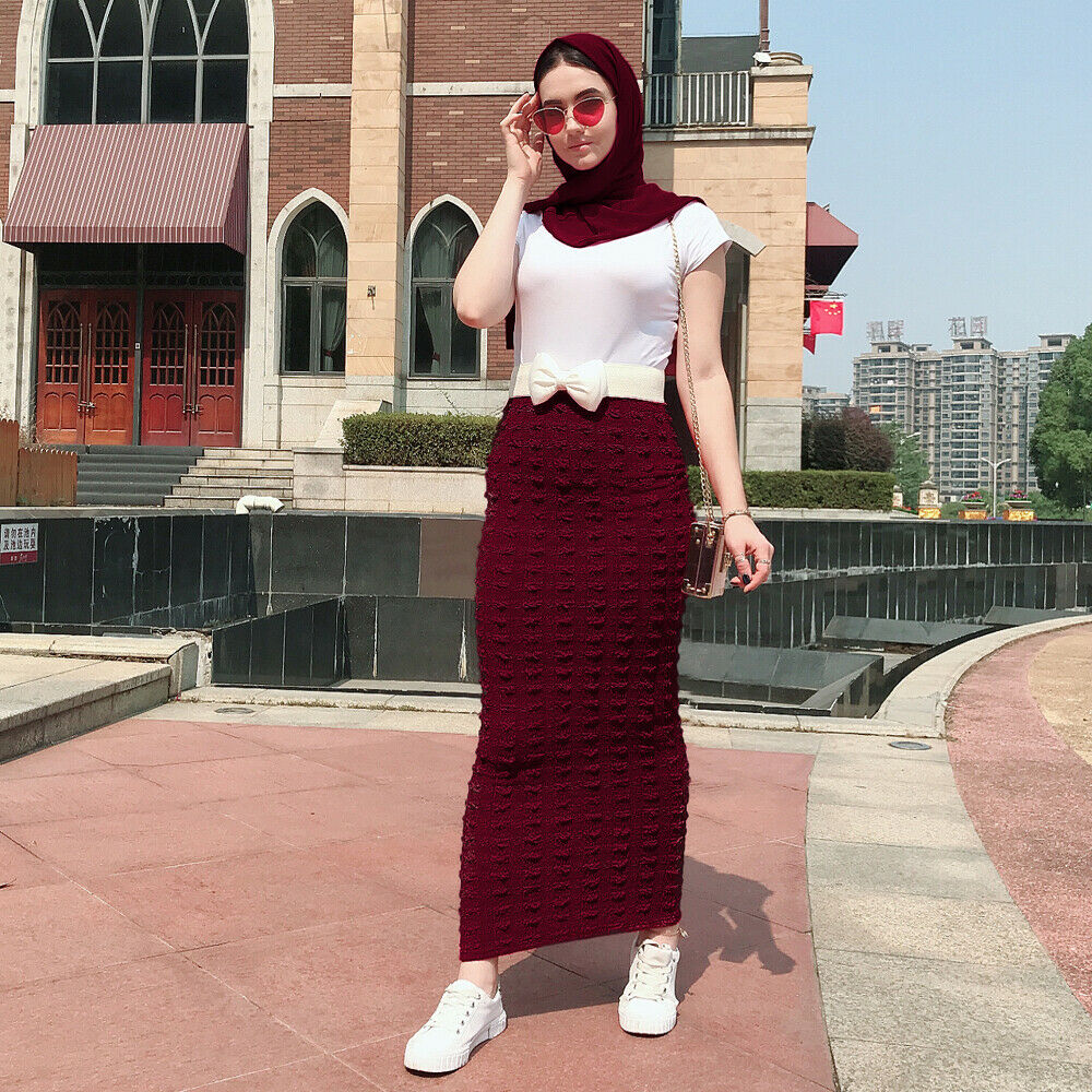 Muslim Women Maxi Skirts High Waist Buttons Knitted Stretch Bodycon Sheath Long Skirt Solid Femme Pencil Skirts Abaya Islamic