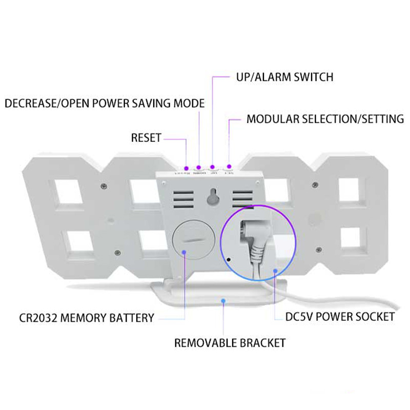 Attributes : 3D digital LED wall clock,big wall clock with LED light,led light for bed room decor design,led strip lights decoration for wall bedroom,clocks wall home decor living room luxury,wall home decor with light,bedside table clock,clocks wall bed room decor for teen girls,display time\date\temperature,2 kinds of alarm,3 modes,automatically adjusted with external light
