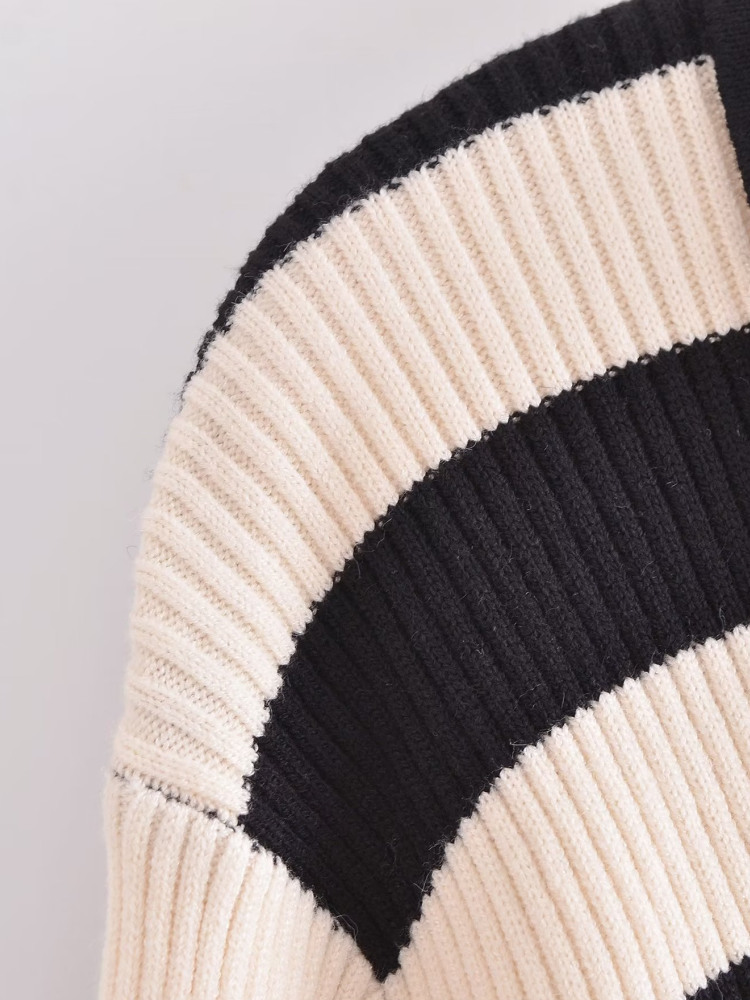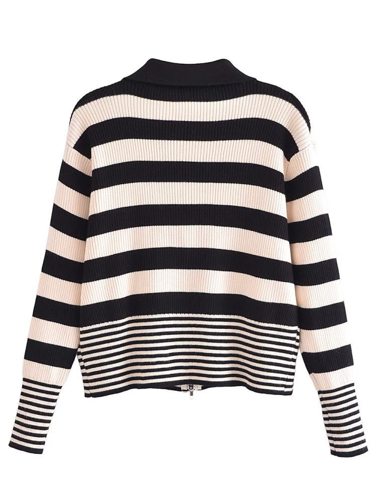 PUWD Women Lapel Patchwrok Striped Sweater 2022 Autumn Winter Fashion Girls Casual Female Long Sleeve Zipper Cardigan Sweater