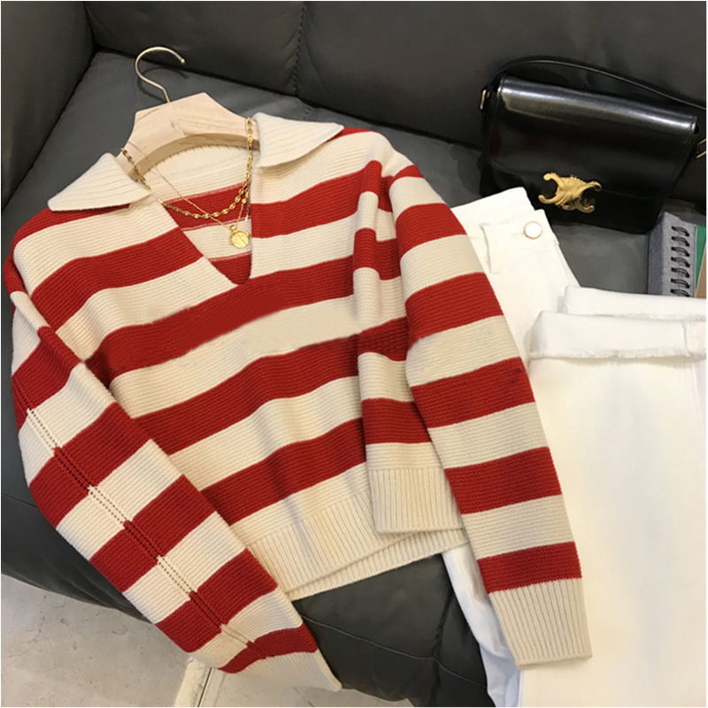 Polo Collar Sweater Women's Autumn And Winter Striped Red Casual Loose Pullover Short Knitted Sweater Long-sleeved Top Y2K