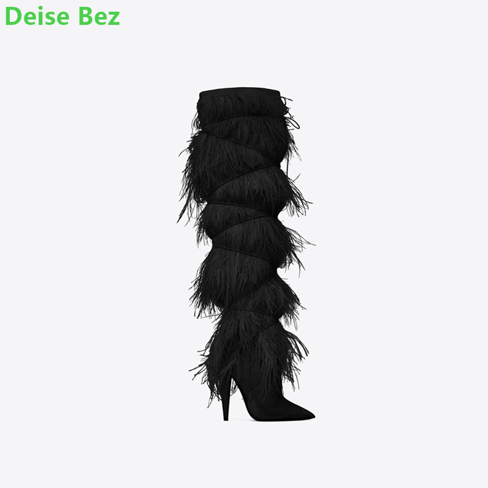 Product Name:Runway Feathers Tassel Long Boots For Women 34-45 Size Solid Pointed Toe Thin High Heel Knee-High Handmade Fashion Sexy Shoes
