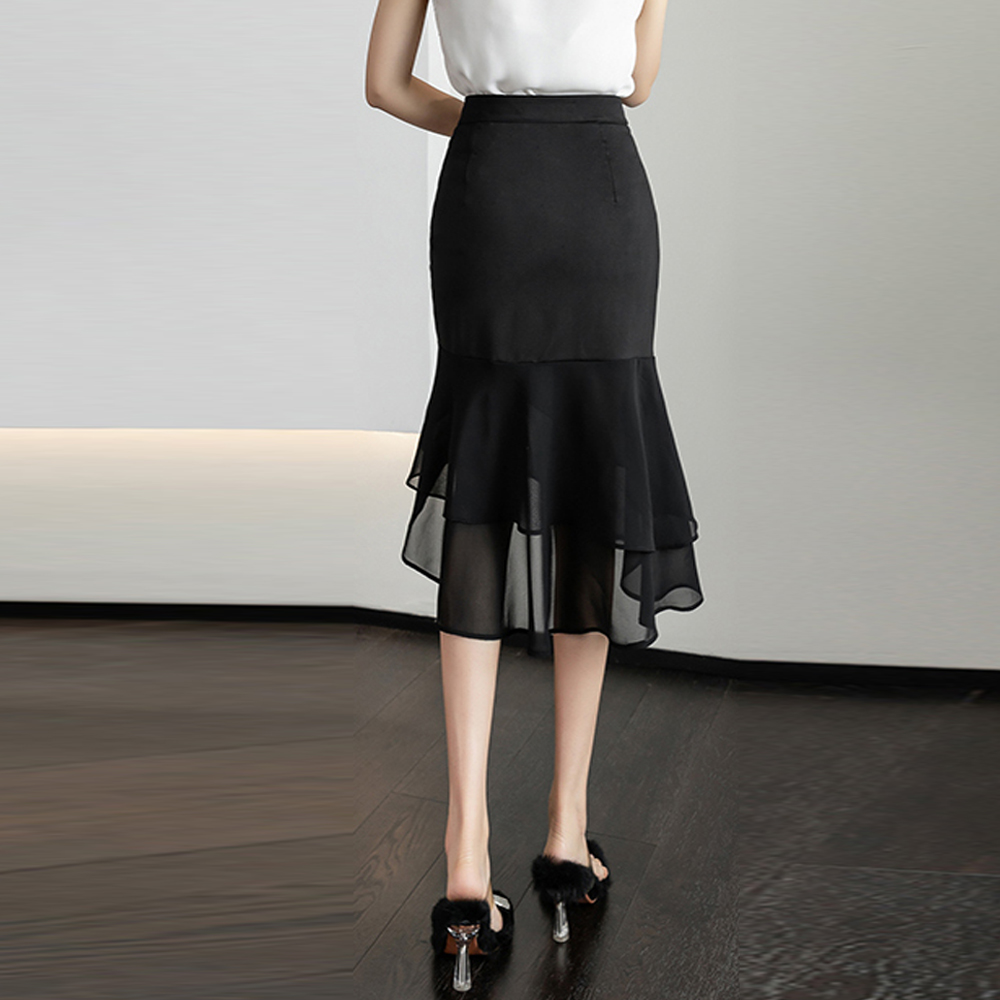 Spring Summer Wrap Hip Mermaid Skirts Women Chic Double-Layer Mesh Ruffles Stitching High Waisted Split Skirt