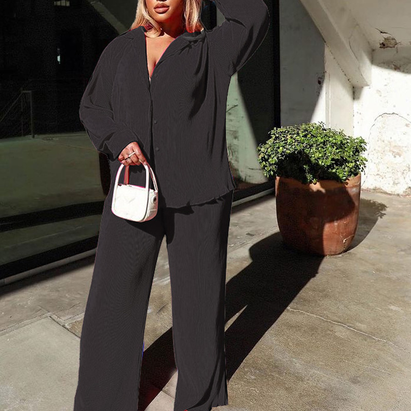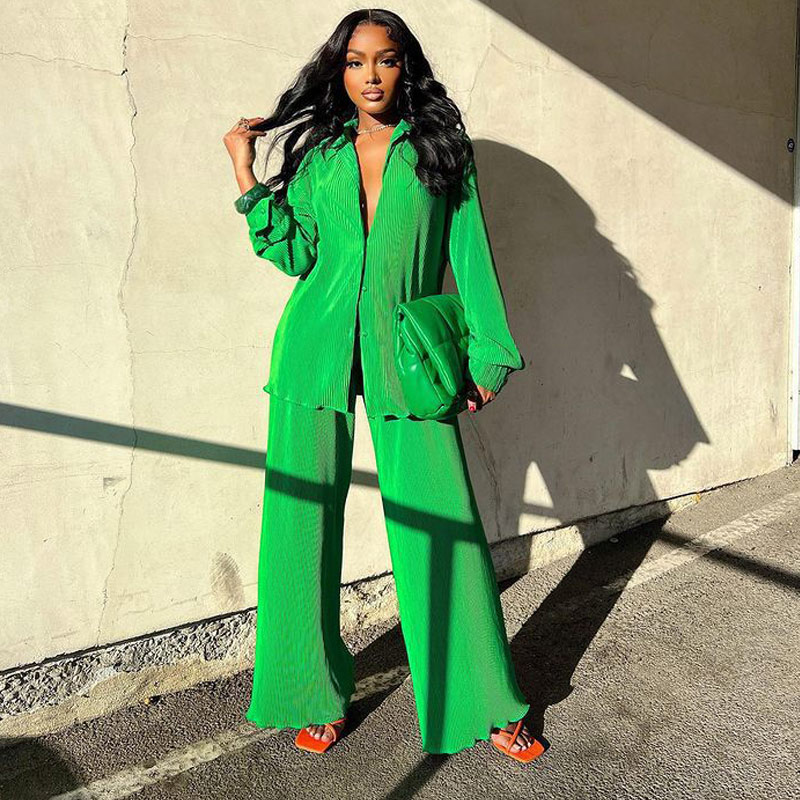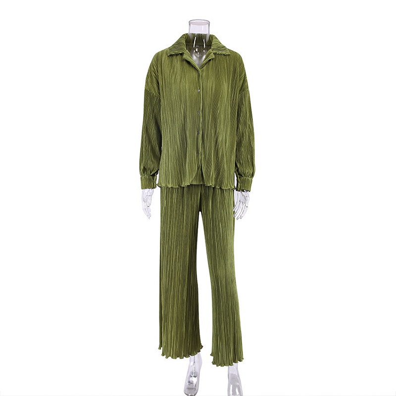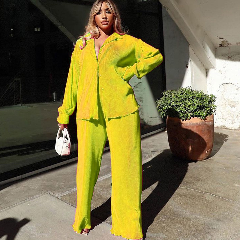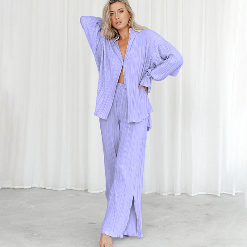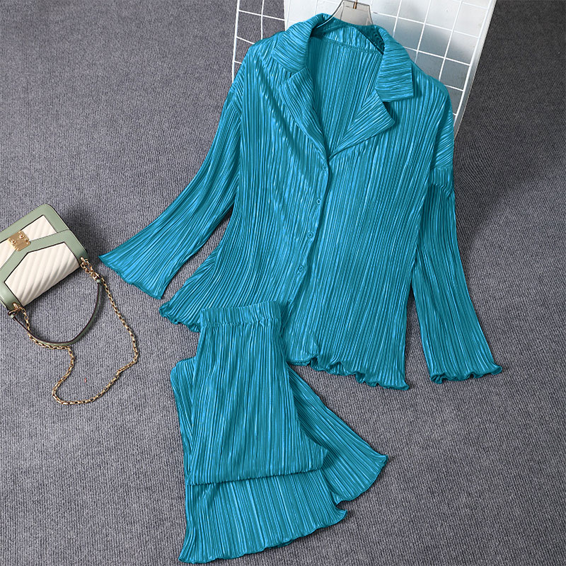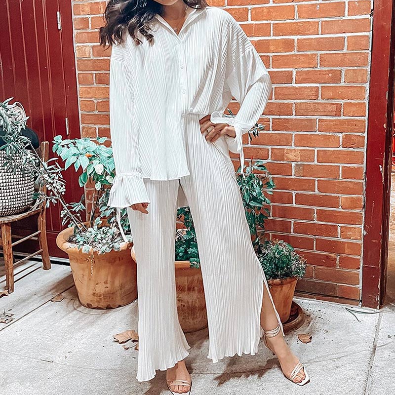 Spring Women's Shirt Pleated Two Piece Set Loose High Waist Wide Leg Pants Suit Casual Elegant Office Ladies Female Outfit